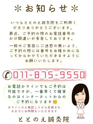 実は、最近お電話のかけ間違いで一般の方のご自宅に何度も間違い電話がかかってしまっております。 留守番電話にご予約のご希望が吹き込まれていたり、ナンバーディスプレイではないそうでどなたからのお電話なのかも分からない状態で、お困りとのご相談があ…